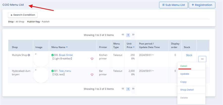 COO menu detail can be opened by clicking directly on the name or by pressing detail tab as shown in the picture. After that, the detail pages opens up where the user can view the details of the respective COO menu.