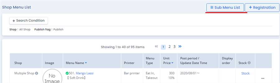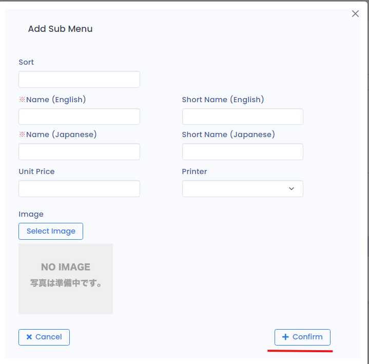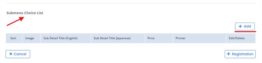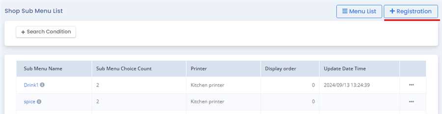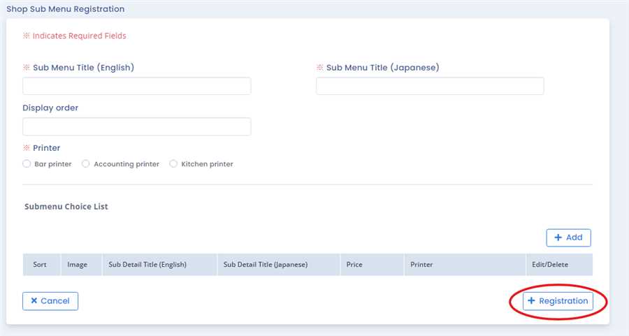 After pressing Registration button,menu registration form opens up where you can fill up required information like Sub menu name, printer, sub menu choice list and press Registration button to register the Sub Menu.