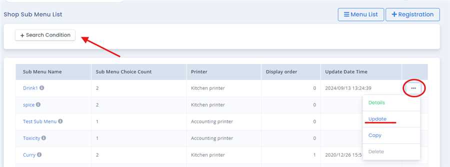 You can update the Sub Menu at Shop Menu List by pressing ... tab of the sub menu that the user wants to update.This open up a list of operations and you can update the selected sub menu by pressing Update tab.