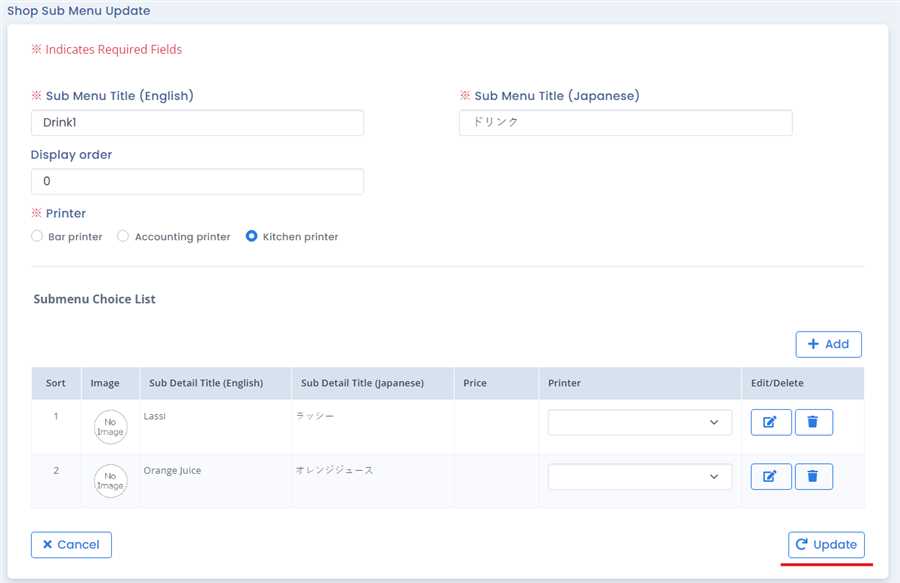 By editing the required field you simply can Click the Update button in sub menu update form to update the menu. By this process/ procedure you can perform simple update of a Menu in the POS system.
