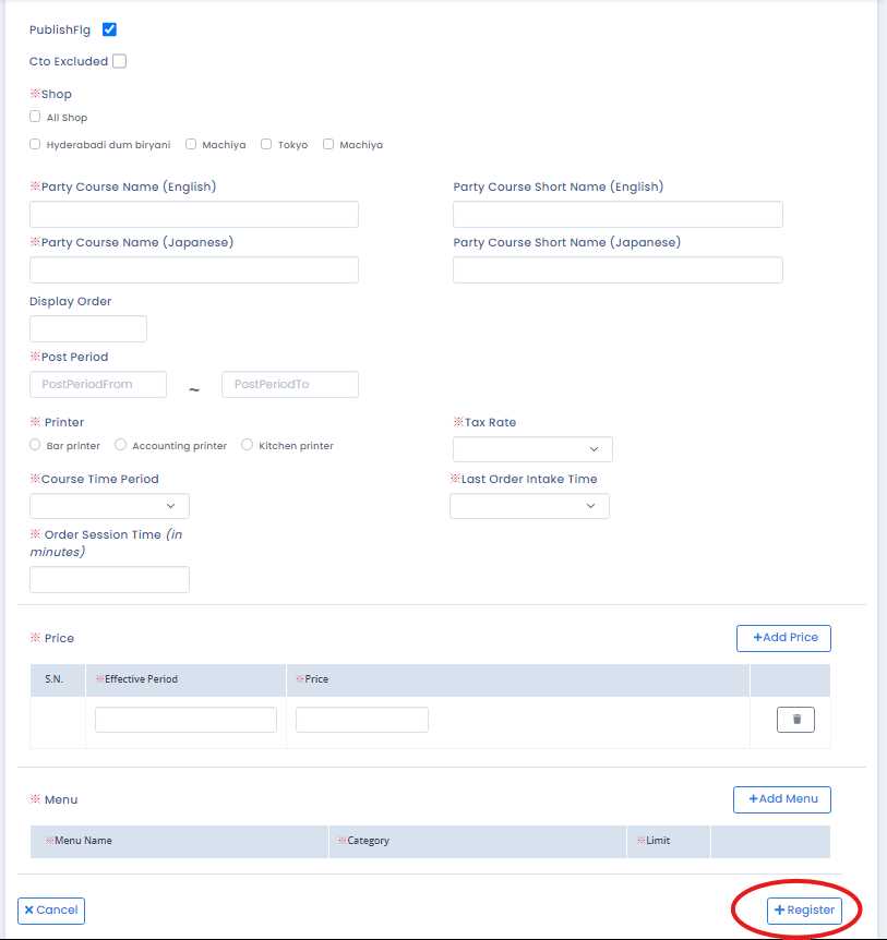 Finally, filing out all the necessary information user can press registration to register the party course. By this process/ procedure you can simply make an entry of a Party Course in the POS system.