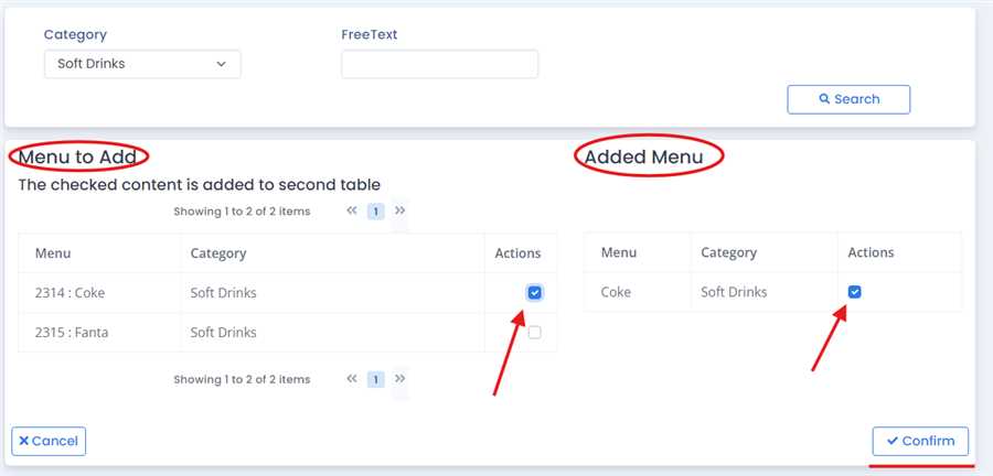 User can add/remove the menu form the list to the list of the party course by checking or unchecking the menu registered. Finally, confirm button is pressed to confirm the menu in the party course. It can be edited any time by pressing Add Menu button