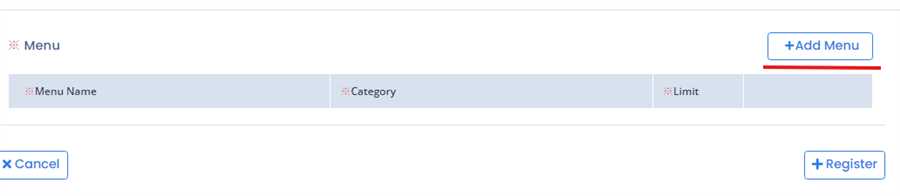 You can add menu by pressing add menu button as shown in figure below. Note the registered menu is shown only for selected shop.
