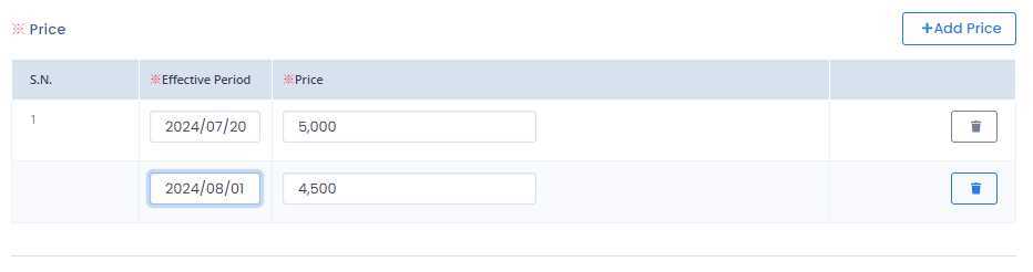 Price: The Price Section is used to enter the Price of that party course you are creating. There is facility of making the menu price different for the different period of time. You can set price of some amount till the date that you selected at effective period. Then you can Add price for other period of time with another amount of money. You can add multiple price for the different set of time period. as shown in above: