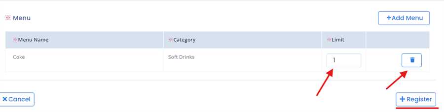 After adding menu it appears in the list as shown below. User can add limit to the menu which denotes the limit that the user can order in certain time period. User can also press trash icon to remove the menu from the list as shown in the figure below: