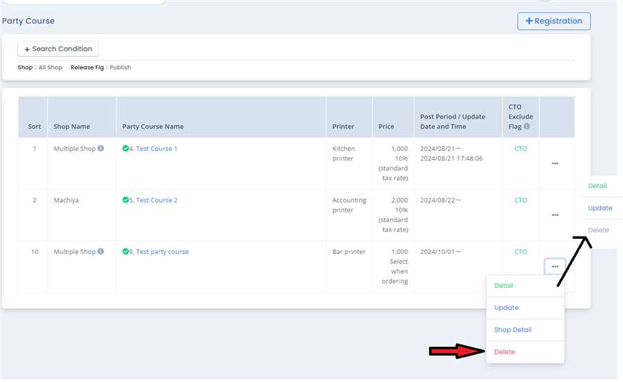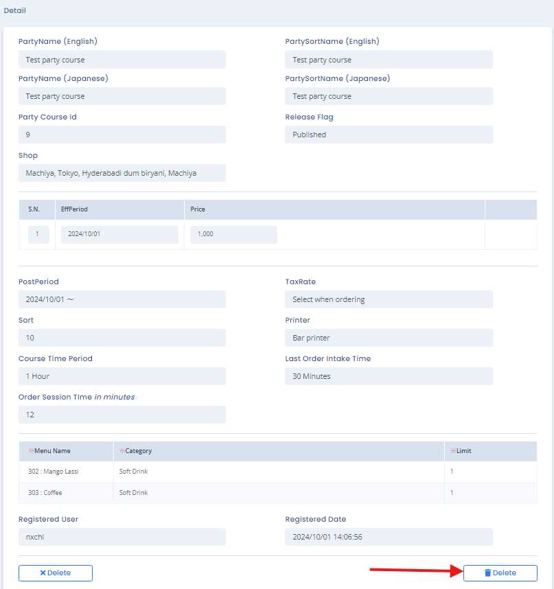 At this point, since the party course has not been active(e.g., no customers has currently used party course), it is possible to delete it.