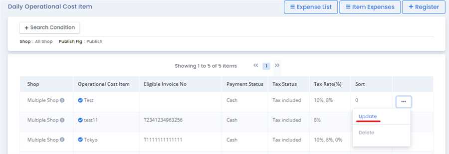An item list is displayed. Press the "Update" button next to the item you wish to update.