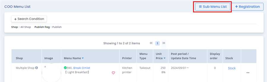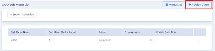 Click on Sub Menu List where it opens up registered COO Sub Menus and you will find the Registration button besides Menu List on the top right where you can register COO sub menu.
