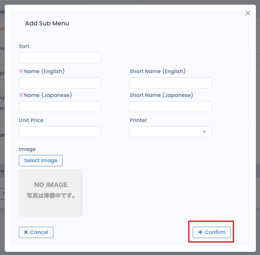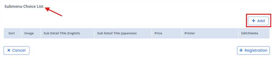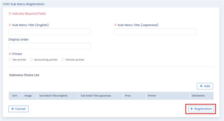 After pressing Registration button,menu registration form opens up where you can fill up required information like Sub menu name, printer, sub menu choice list and press Registration button to register the Sub Menu.