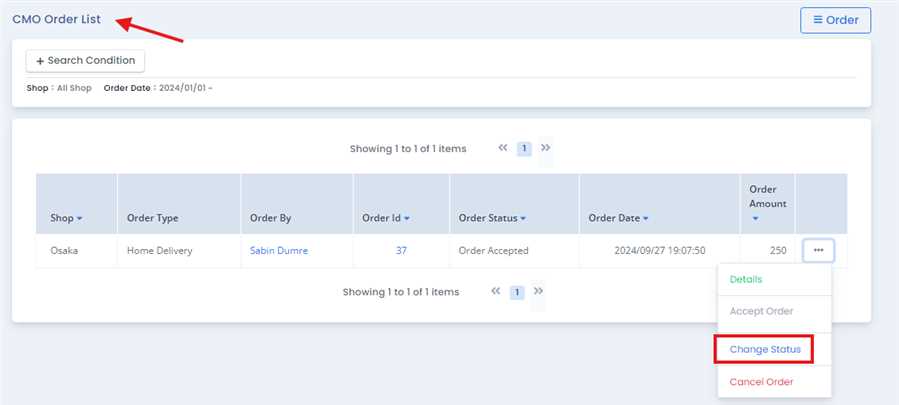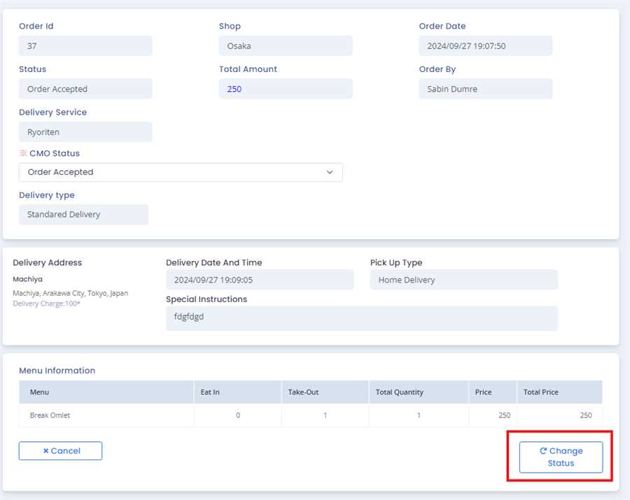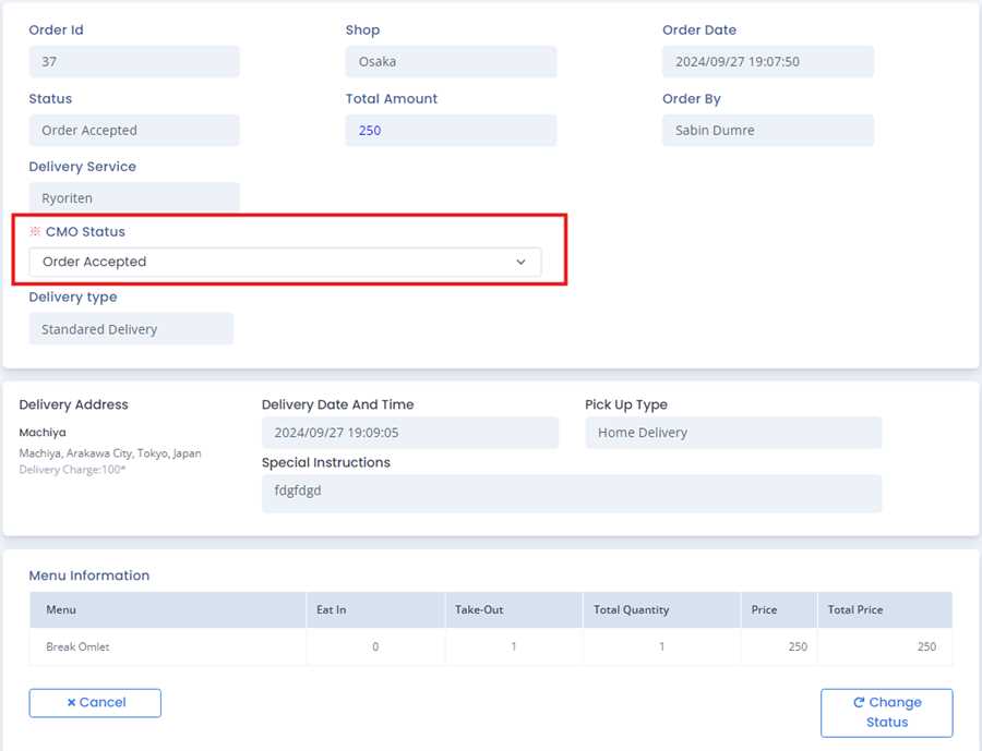 After pressing Change Status, a form opens up which contains the information of that order.User cang change the status of the order by changeing the status in CMO status dropdown.