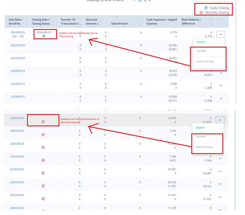 Firstly, Figure Out the reason of buttons being disabled by looking at the color of the Cross in Closing Status column. The blue indicates Daily Closing while the red indicates Monthly Closing.