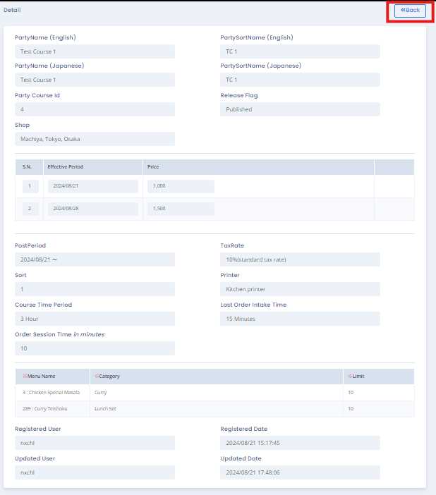After pressing Detail button a form opens up which gives detail of the respective Party COurse.User can return to the party course list by pressing Back button.By this process/ procedure you can simply view detail of Party Course in the POS system.