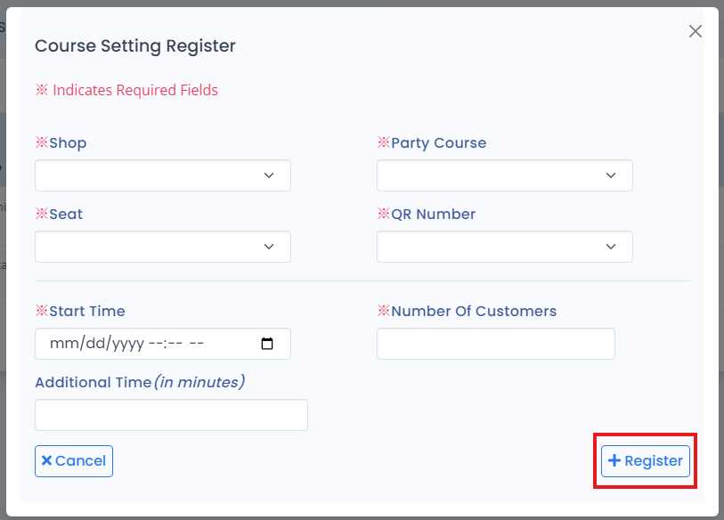 After pressing Registration button,a pop up form opens up where you will fill required information like shop,party course,seat,QR number, start time,no of customers and additional time.