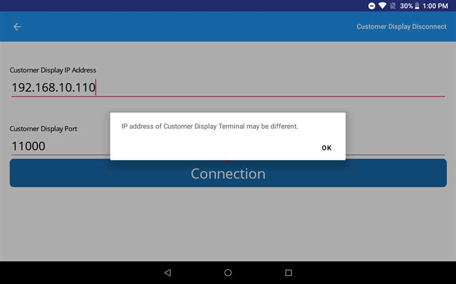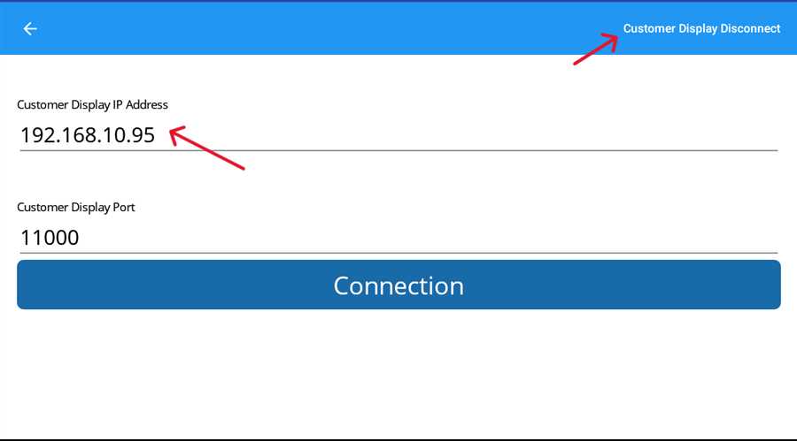 Here, IP address of Customer Display terminal is added to the field. Additionally user can manually disconnect the terminal by tapping on Customer Display Disconnect.