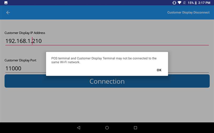 1) POS terminal and Customer Display terminal must be connected to the same Wi-Fi network.