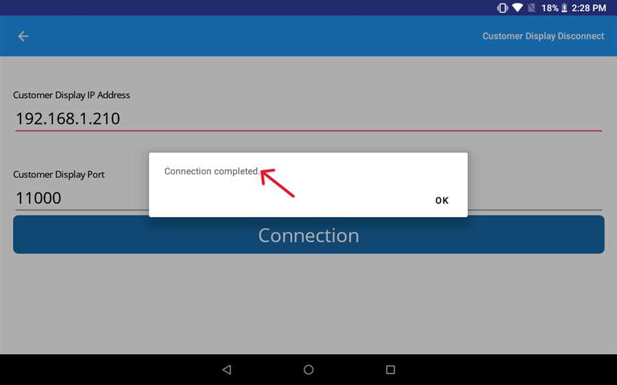Finally, if all the process is correct after pressing Connection button a dialogue appears saying "Connection completed" to indicate that connection between POS and Customer Display Terminal has been successfully established.