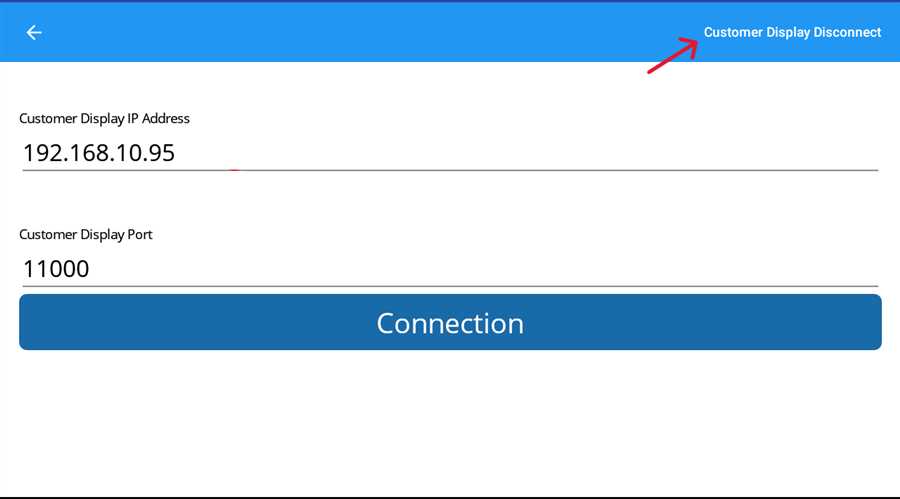 Customer Display Connection page apppears and then tap on the "Customer Display Disconnect" button on the right side of the page. This will disconnect the Customer Display from the POS terminal accounting.