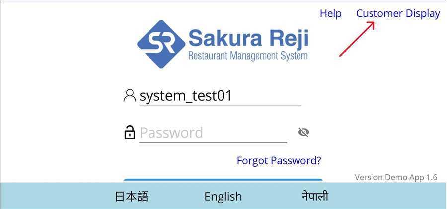 Firstly, to access the customer display terminal user needs to go to login page of the POS app. At top right, there is Customer Display section besides Help. Tap on Customer Display to open customer display terminal.