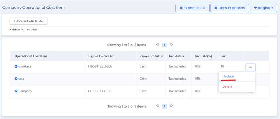 An item list is displayed. Press the "Update" button next to the item you wish to update.