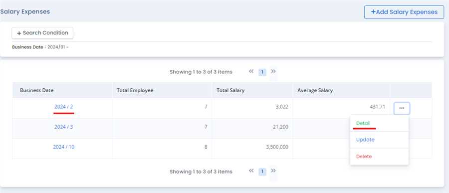 As item list is displayed, user can view detail of the salary expense by clikcing on the date or "Detail" button inside ... tab as shown in the figure below