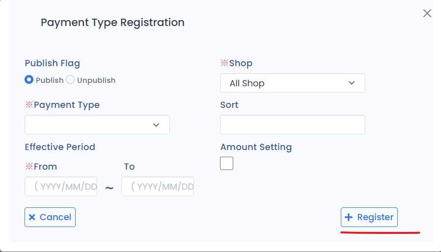 Click on New Registration button ,payment type registration pop up form opens up where you can fill up required information like payment type name, for specific shop or all shop , etc and press Registration button to register the Payment Type .