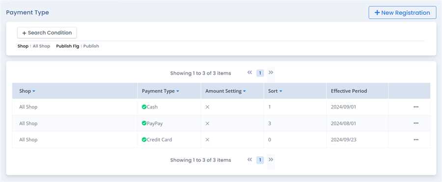Click on Payment type, then you will find the Payment Type List with registered Payment type with their information, where you will find the New Registration button on the top right.