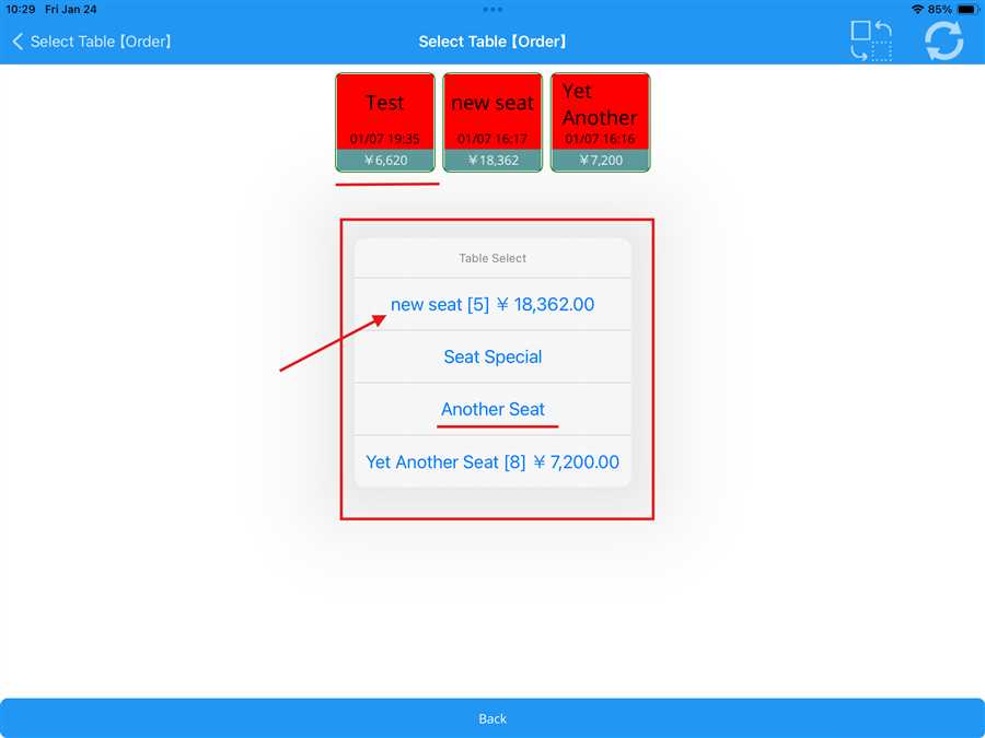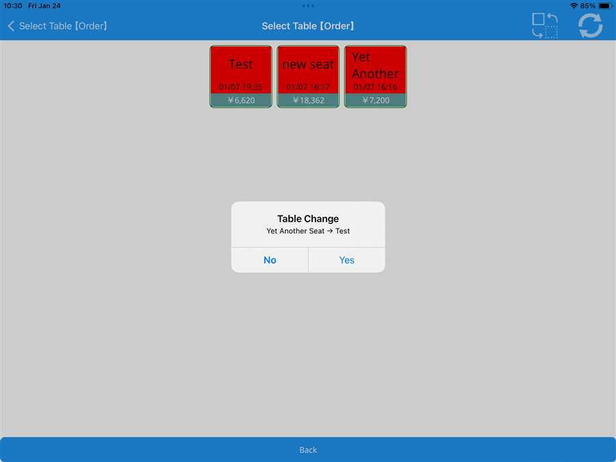 In this picture, Test table is pressed(red underline).After pressing a pop up box appears which shows a list of tables, if the user wants to shift the order from one table to another Another Seat table is selected (red underline).Note: This is not a merge beacuse there is no data in this table.
