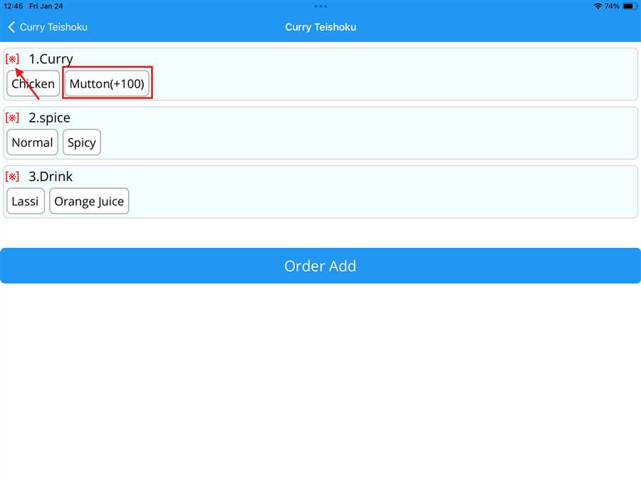 Here [*] (red arrow) before curry denotes that the curry has to be selected and Mutton(+100) denotes that the selecting Mutton(red box) is going to add 100 to the price of the menu.