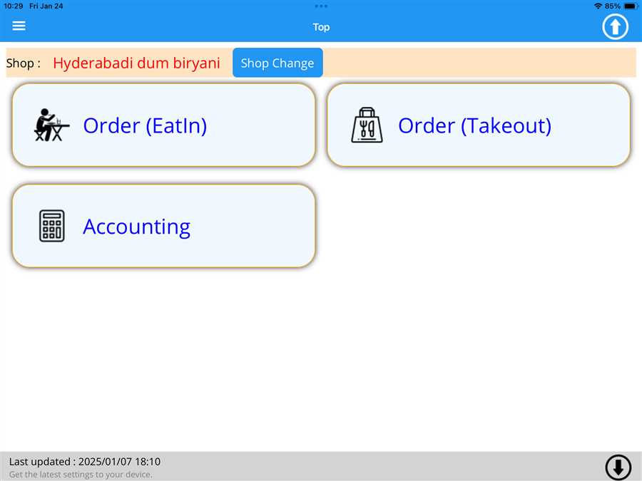 Open the POS app on your handheld device and log in. After logging in, the top page will open, displaying the sidebar options along with "Order (Eatin)" "Order (Takeout)" and "Accounting" on the top page, as shown in the picture below.