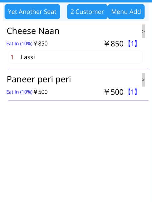 This section of the accounting page displays the name of the ordered menu item, along with its submenu choices and price. For example, 1 Cheese Naan (Eat-in 10%) is ordered at a price of 850, with Lassi selected as the submenu option.