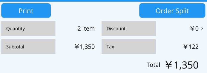 As shown in the picture above, this section displays the quantity and price of the ordered menu, along with the applicable tax amount. There is also an option to print the receipt and split the order, which is explained separately in another section.