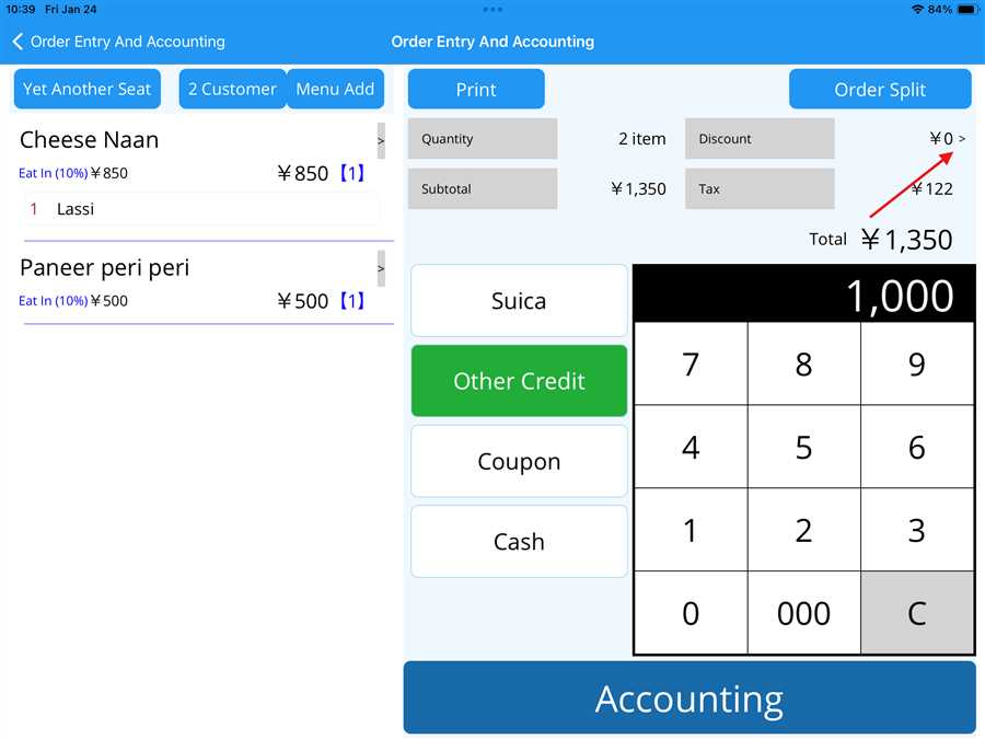 The user can apply a discount by pressing the '>' button on the screen, as indicated by the red arrow in the picture above. Discounts can be applied in two ways: By rate or by amount.