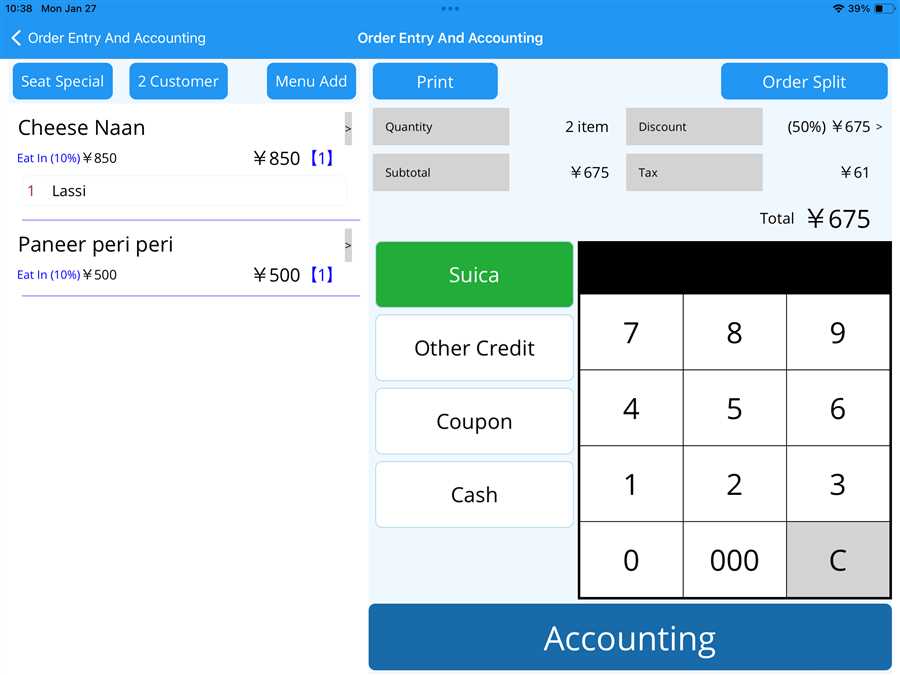 Here,Another Seat is the table registered to the shop shown by red box and ¥ 1,350 is the amount accumulated on the test table shown by the red arrow.