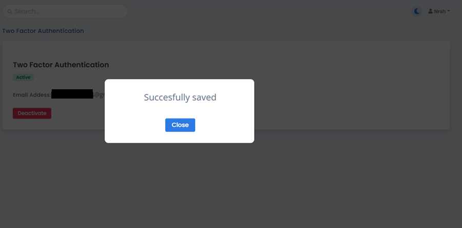 Click on the Close button on the success pop up. You see the previous Two Factor Authentication page. Now you can see the 'Active' status of the Two Factor Authentication. The email you entered also can be seen here.