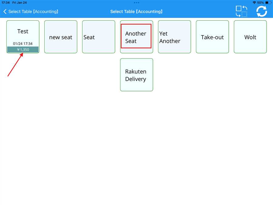 Here,Another Seat is the table registered to the shop shown by red box and ¥ 1,350 is the amount accumulated on the test table shown by the red arrow.