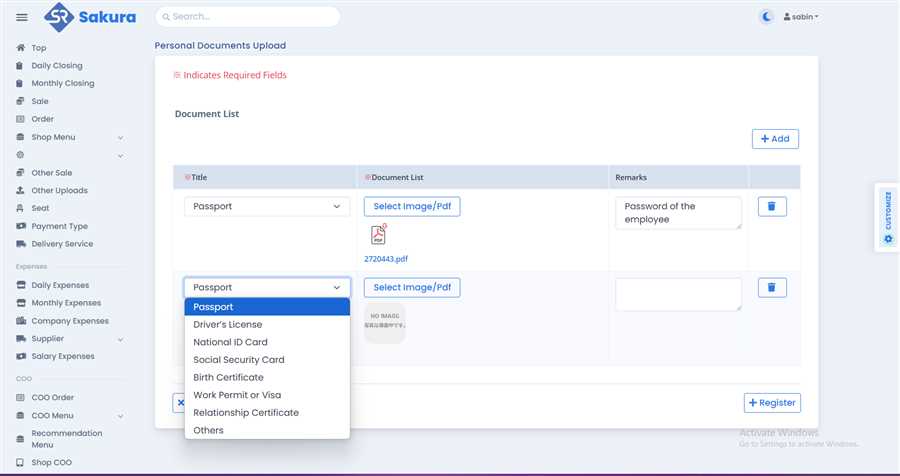 - In the "Remarks" field, add any specific notes about the document (e.g., "Password of the employee").