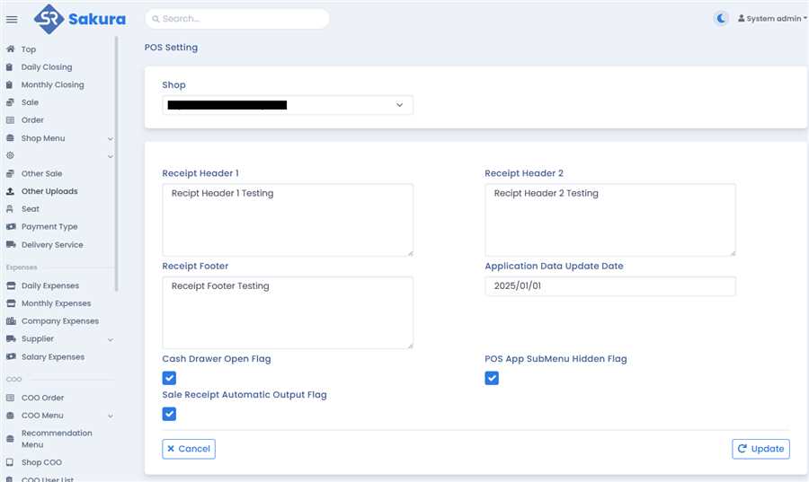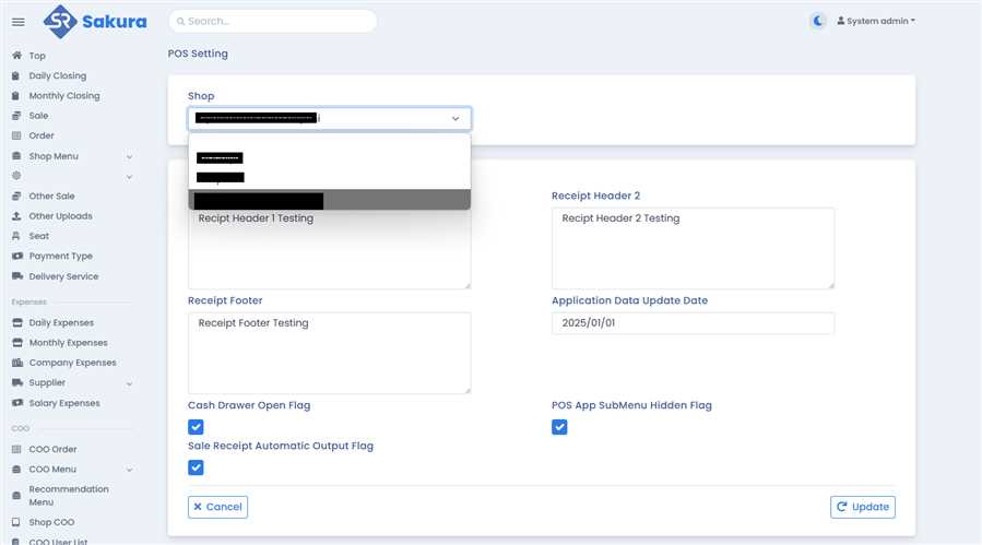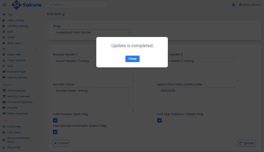 2. Application Data Update Date: Suppose you make changes to menus, submenus, seat, payment type,etc. and the POS app automatically update when you goto top page in the app. Now, if you set this 'Application Data Update Date' then, setting this date will pause the updates till that date on the app. The next update will occur on the day you set here. Till then no updates for any changes you make on POS web regarding menu, seat,etc.