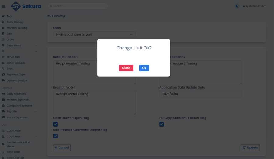 You can now make any changes required as per your need in the shop. After setting the values as per you requirements, click on the Update button. A pop up appears for your confirmation. Confirm your changes.
