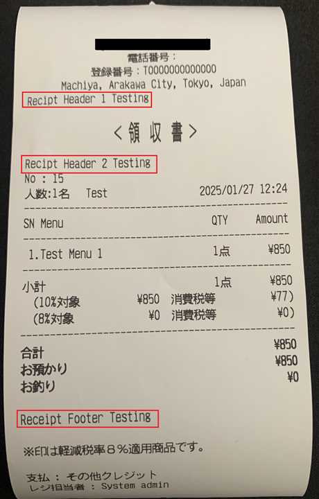 1. Receipt Header 1, Receipt Header 2 and Receipt Footer: These are the custom header and footer you can set in the receipt you print after accounting the order of certain table. You can customize the bill using these. A sample is shown below based on the setting above: