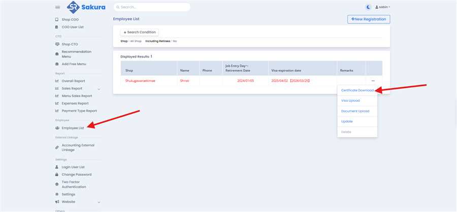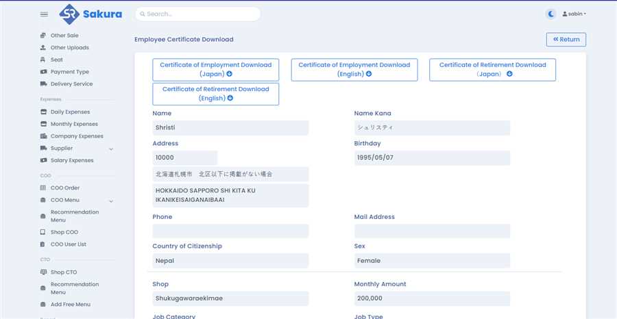 After opening the Employee Certificate Download page you will see the detail of that employee and at the top there is certificate download buttons from where you can download the certificate of employment in japanese and in english language also you will see the Certificate if retirement download in both langauge.