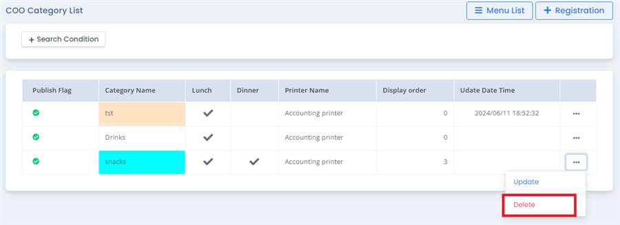 Press delete tab after pressing (...) button. Note: If the delete flag is disabled the category has already been used.