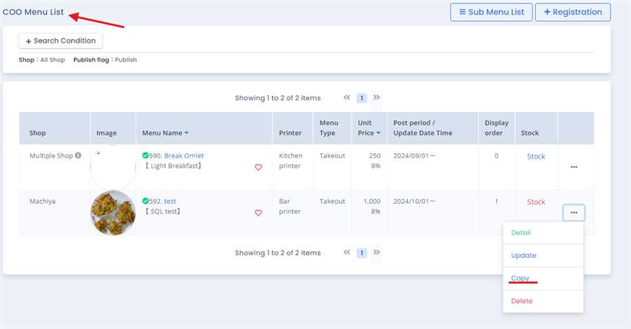 You can copy the COO menu by clicking on copy button in(...)tab in COO menu list. NOTE: Duplicate items cannot be created.