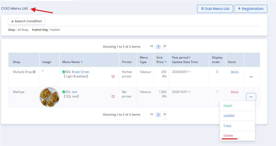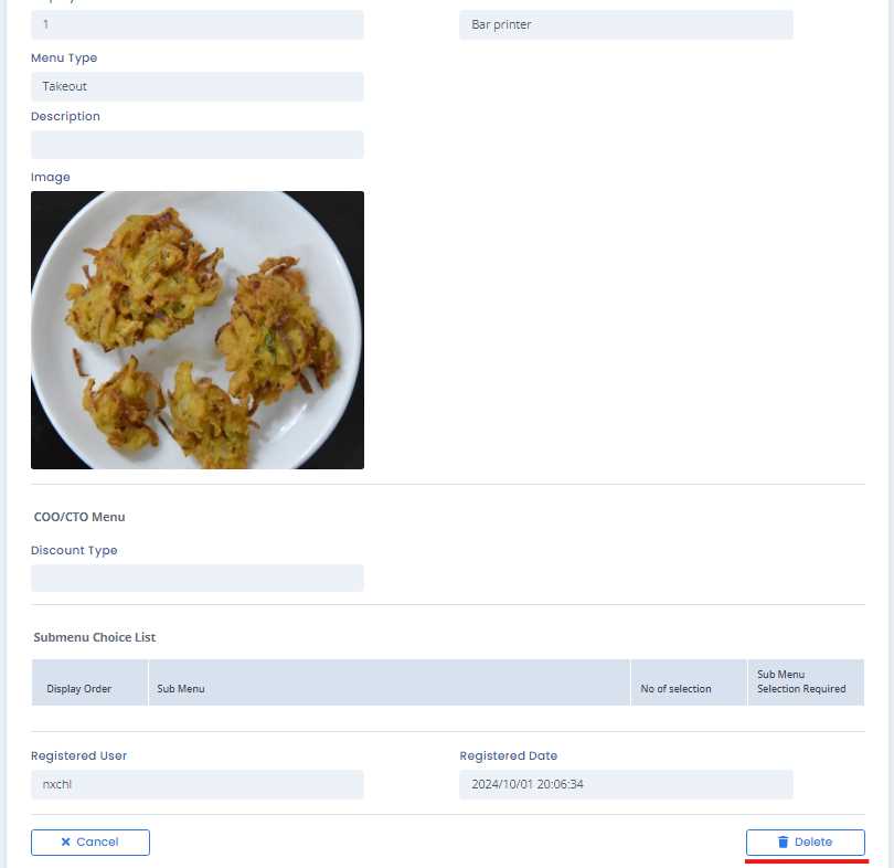 Detail page opens up which shows detailed information of the COO menu. Now, delete button can be pressed to delete the selected COO menu.