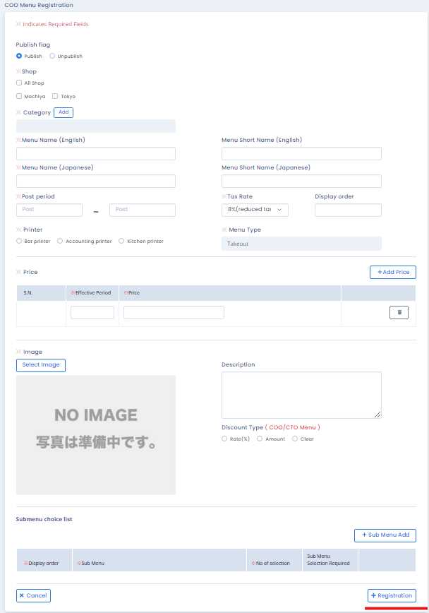 Registration forms opens up where information is filled up by user. Additionally, sub menu can also be added as shown in the figure above.