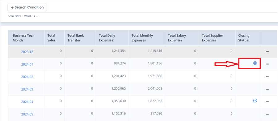 The blue cross in closing status column indicates that monthly closing of that row is executed.