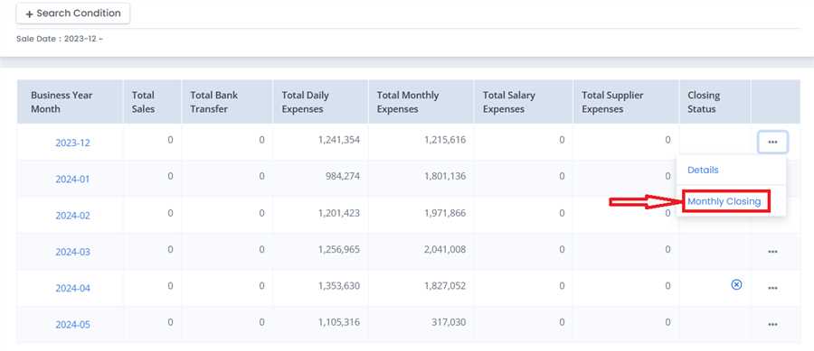 Click 'Monthly Closing' in main navigation bar to open Monthly Closing page/list.