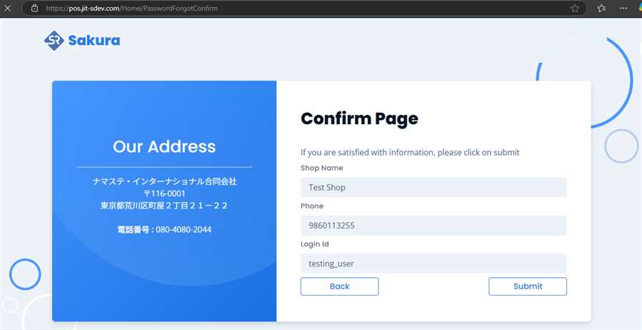 3. Fill in your information in the form and click on the Submit button. A confirmation page appears as seen in the image below. Check the data you have entered and click on Submit button. Click on the Back button if you need to modify the data again.