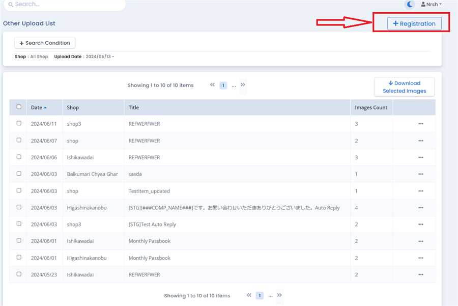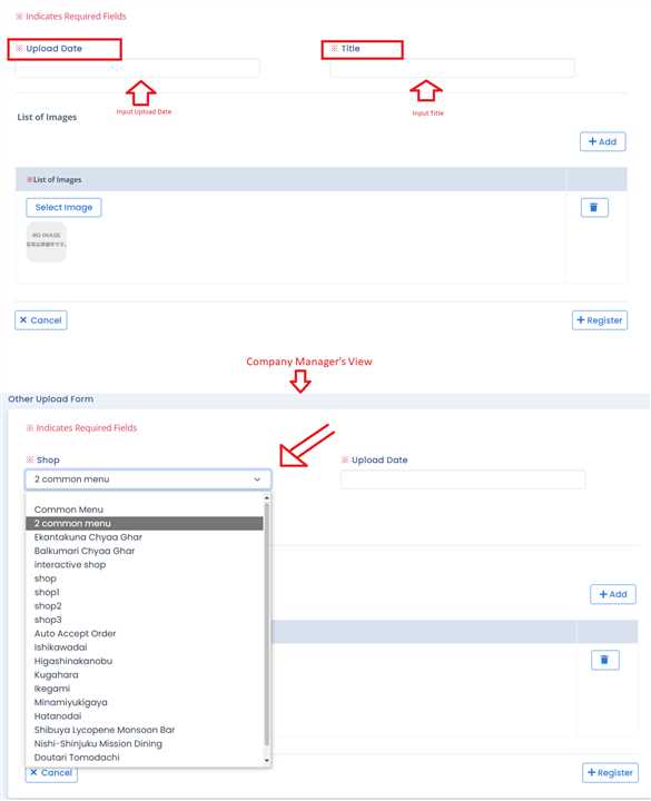 Input Upload Date and title in the form that opens after clicking 'Registration' Button. You must also Select a shop if you are Company Manager/General.
