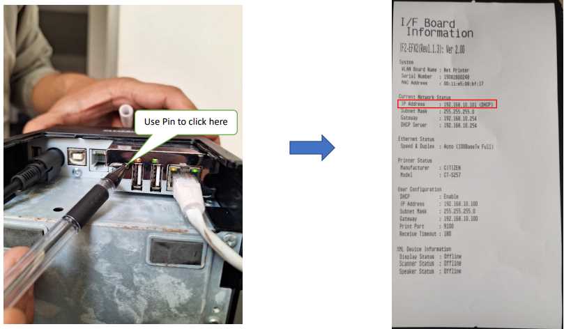 After turning on the printer, do as in the image and get a slip printed from the printer. It contains the network information of the printer along with other hardware details depending upon the printer model.