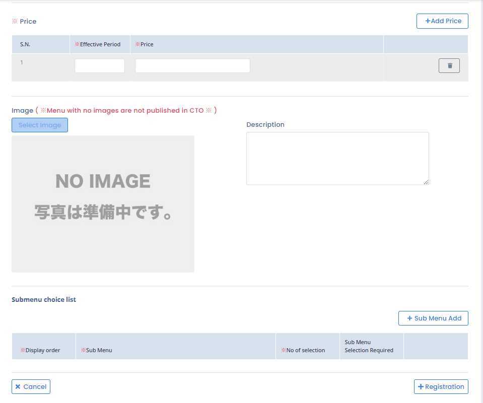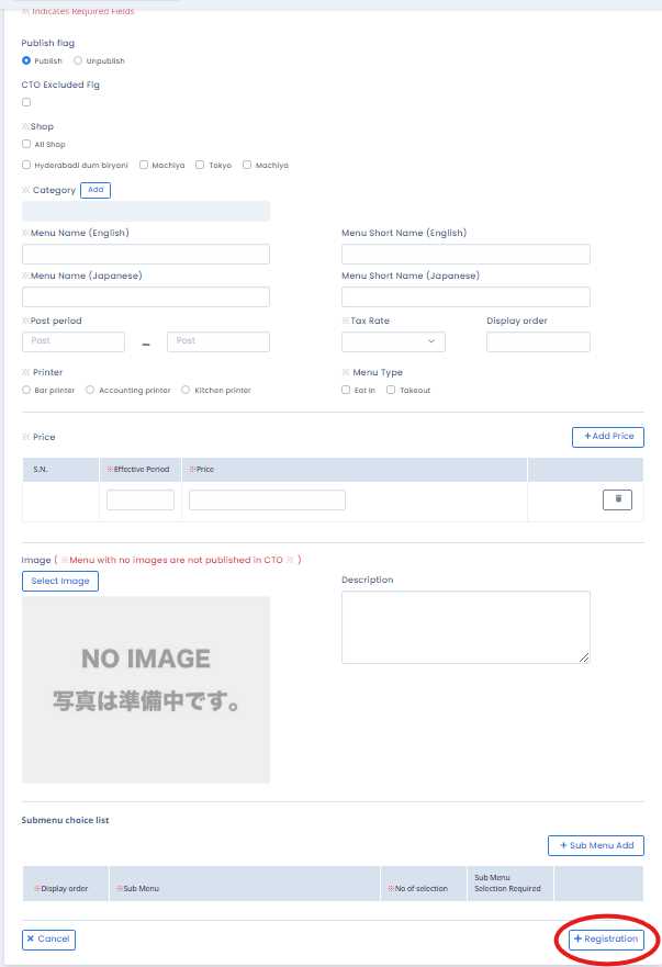 After pressing Registration button,menu registration form opens up where you can fill up required information like Menu name, price, tax,sub menu, image etc and press Registration button to register the Menu.